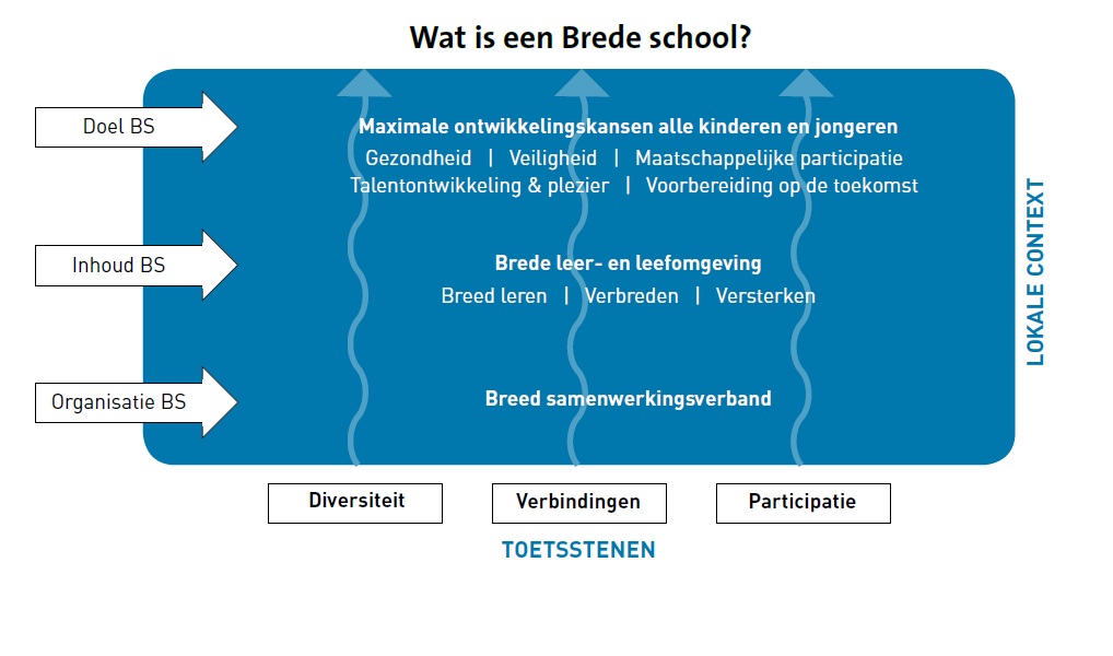 Centraal in het referentiekader Brede School staat de inhoud, namelijk het realiseren van een brede leer- en leefomgeving in de vrije tijd en op school (Ernalsteen & Joos, 2011 Ernalsteen, V. & Joos, A. (2011). Wat doet een Brede School? Werken aan een brede leer- en leefomgeving. Gent: Steunpunt Diversiteit & Leren. ).