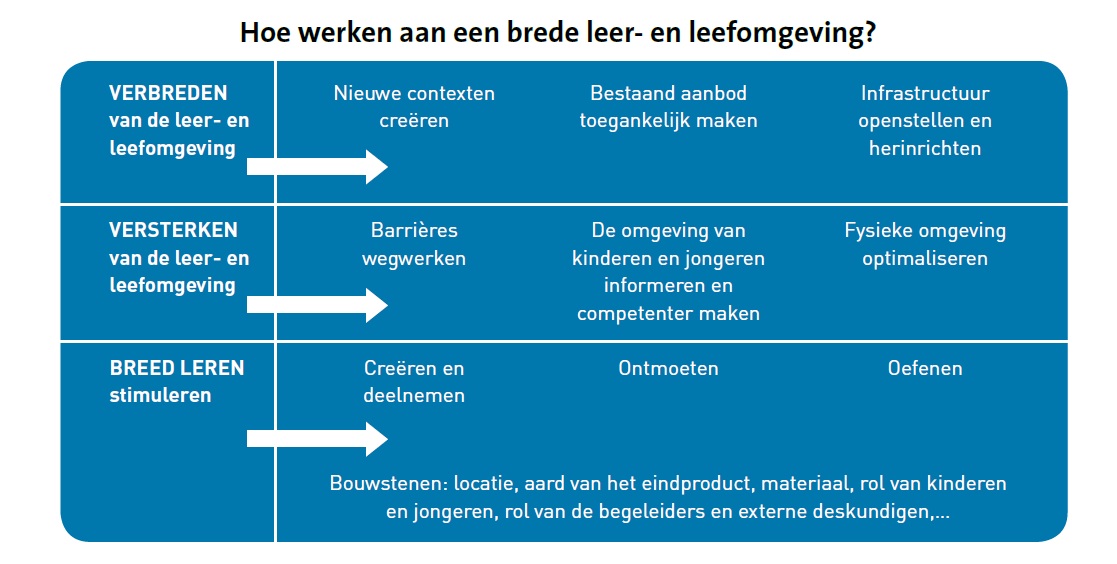 We onderscheiden drie manieren om een brede leer- en leefomgeving te stimuleren:
